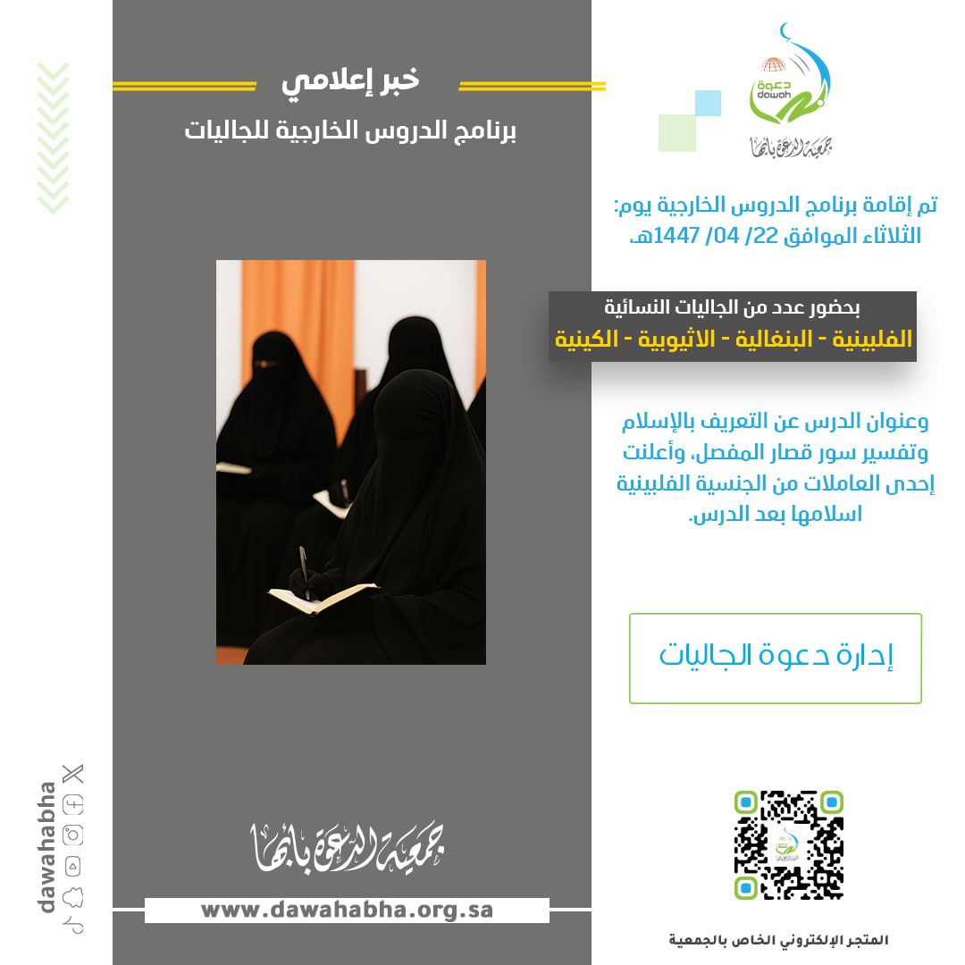تم إقامة برنامج الدروس الخارجية يوم الثلاثاء 22 / 04 / 1447هــ، بحضور عدد من الجاليات النسائية الفلبينية- البنغالية- الاثيوبية- الكينية، وعنوان الدرس عن التعريف بالإسلام وتفسير قصار المفصل، وأعلنت إحدى العاملات من الجنسية الفلبينية اسلامها بعد الدرس.