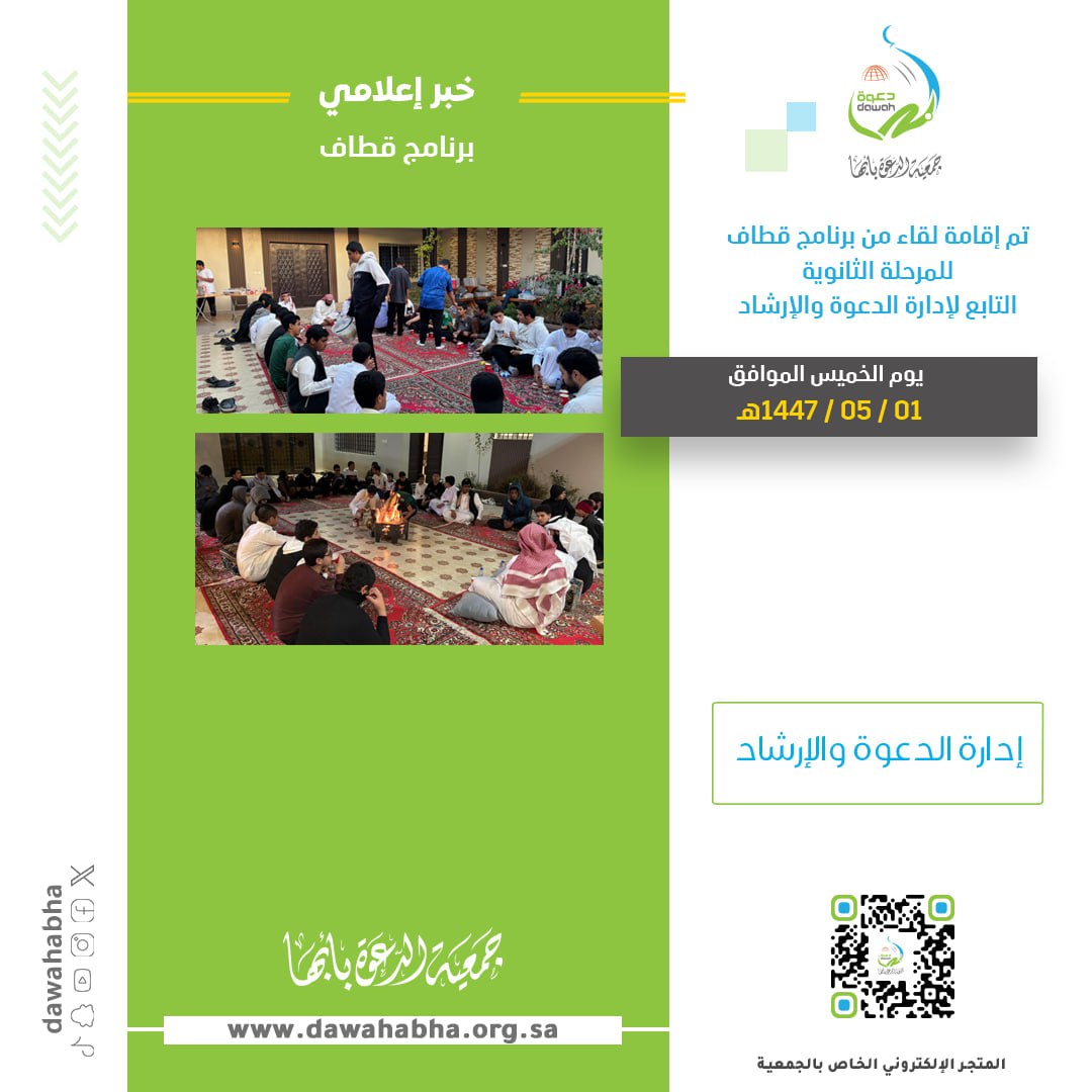 تم إقامة لقاء من برنامج قطاف للمرحلة الثانوية التابع لإدارة الدعوة والإرشاد يوم الخميس الموافق 01 / 05 / 1447هــ.