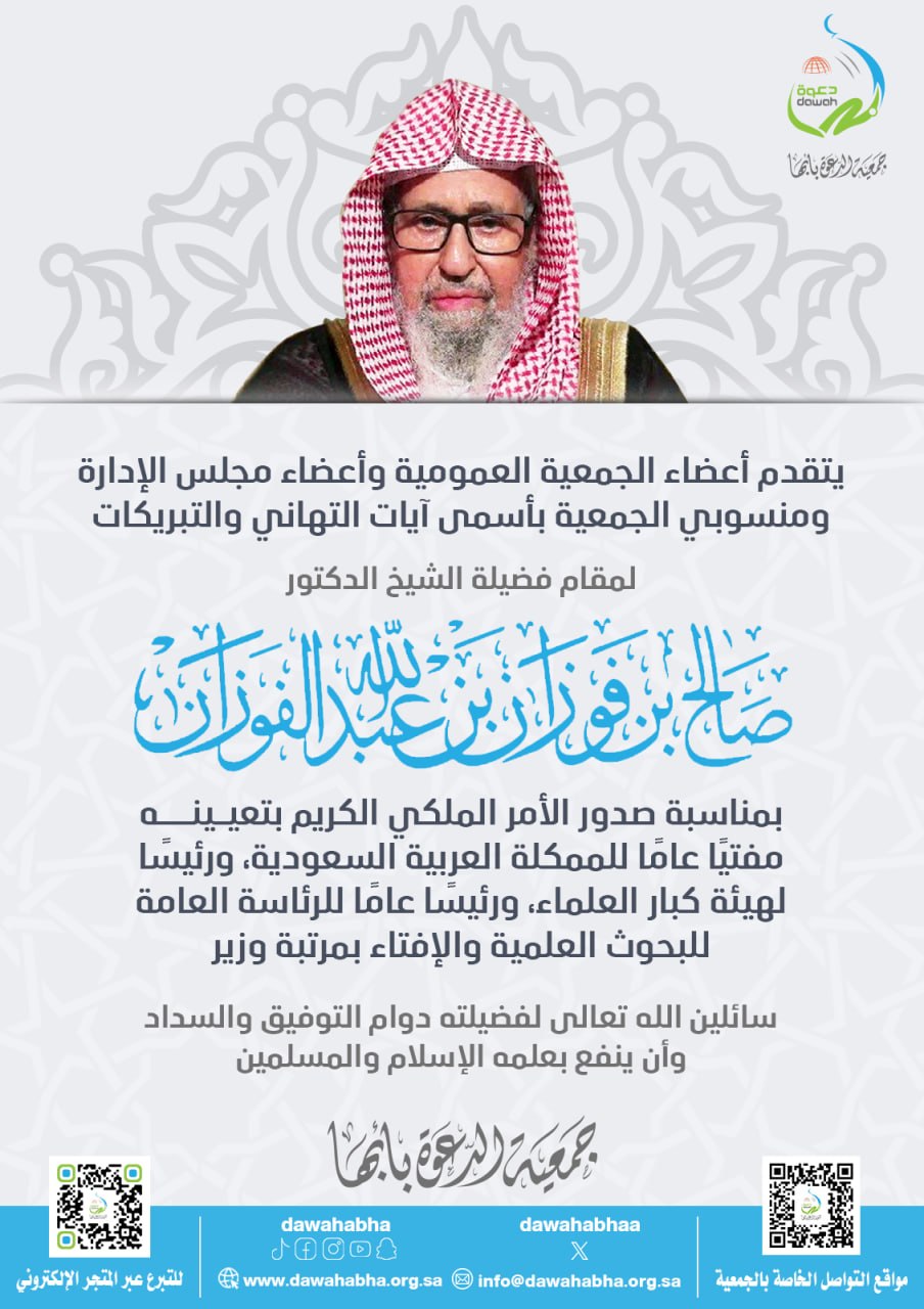 يتقدمأعضاء الجمعية العمومية وأعضاء مجلس الإدارة ومنسوبي الجمعية بأسمى آيات التهاني والتبركات لمقام فضيلة الشيخ الدكتور/ صالح بن فوزان بن عبدالله الفوزان، بمناسبة صدور الأمر الملكي الكريم بتعيينه مفتياً عاماً للمملكة العربية السعودية، ورئيساً لهيئة كبار العلماء، ورئيساً عاماً للرئاسة العامة للبحوث العلمية والإفتاء بمرتبة وزير.