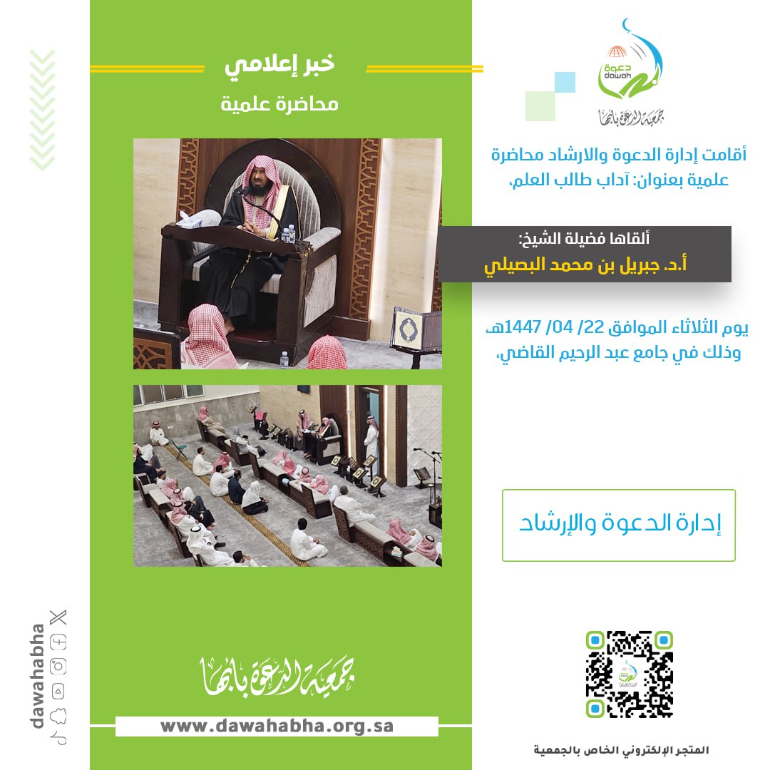 أقامت إدارة الدعوة والإرشاد محاضرة علمية بعنوان: آداب طالب العلم، ألقاها فضيلة الشيخ أ.د. جبريل بن محمد البصيلي يوم الثلاثاء الموافق 22 / 04 / 1447هــ، وذلك في جامع عبدالرحيم القاضي.