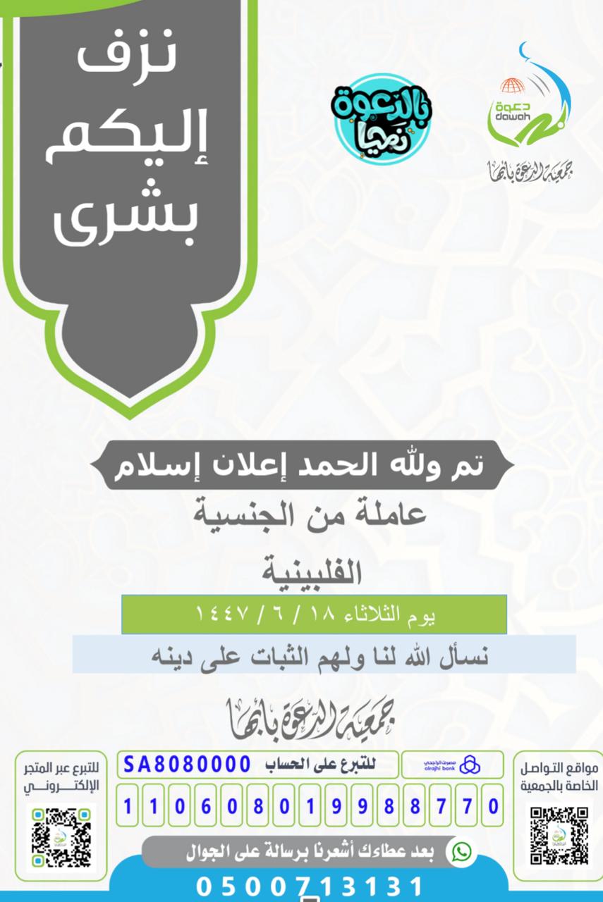 تم ولله الحمد إعلان اسلام عاملة من الجنسية الفلبينية يوم الثلاثاء 18 / 6 / 1447هــ.