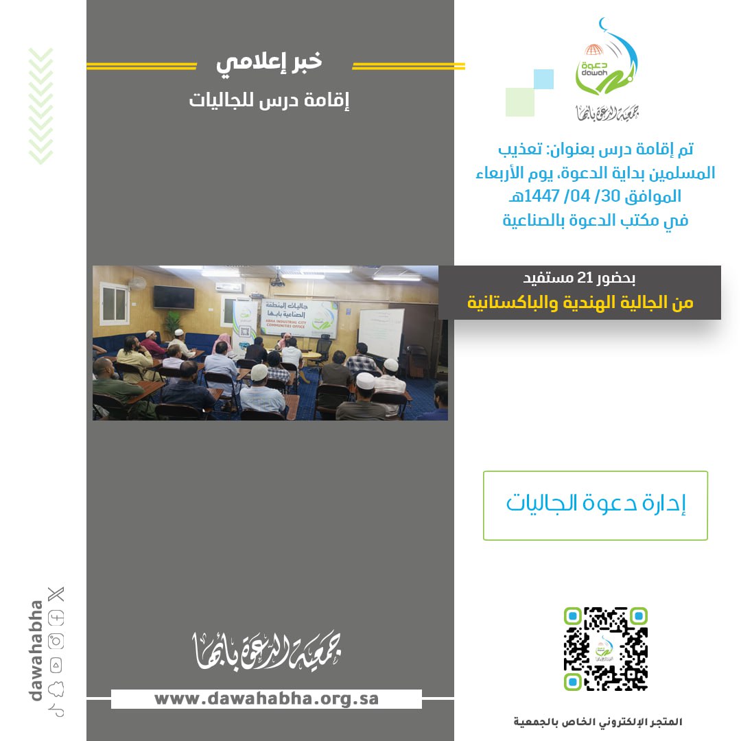 تم إقامة درس بعنوان: تعذيب المسليمن بداية الدعوة، يوم الأربعاء الموافق 30 / 04 / 1447هــ في مكتب الدعوة بالصناعية.