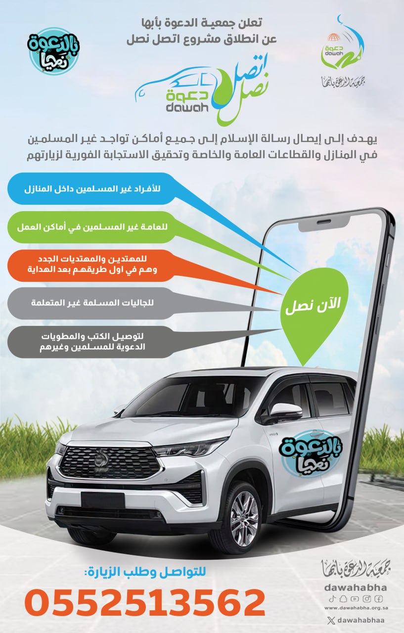 تعلن جمعية الدعوة بأبها عن انطلاق مشروع اتصل نصل والذي يهدف إلى إيصال رسالة الإسلام إلى جميع أماكن تواجد غير المسلمين في المنازل والقطاعات العامة والخاصة وتحقيق الاستجابة الفورية لزيارتهم.