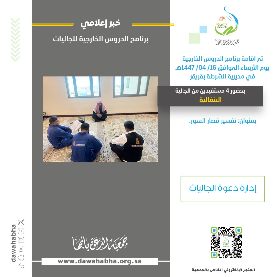 تم إقامة الدروس الخارجية يوم الأربعاء 16 / 04/ 1447هــ في مديرية الشرطة بقريقر بحضور 4 مستفيدين من الجالية البنغالية، بعنوان: تفسير قصار السور.