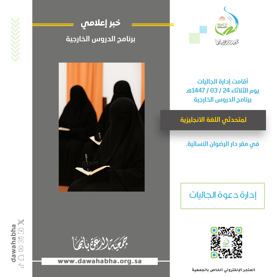 أقامت إدارة الجاليات يوم الثلاثاء 24 / 03 / 1447هــ برنامج الدروس الخارجية لمتحدثي اللغة الإنجليزية في مقر دار الرضوان النسائية.