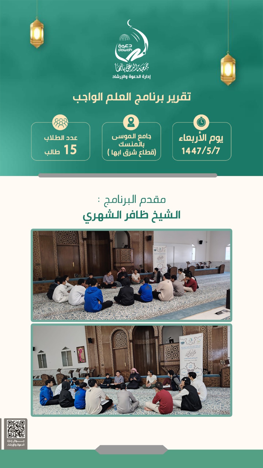 تم إقامة برنامج العلم الواجب يوم الأربعاء 07 / 05 / 1447هــ بجامع الموسى ( قطاع شرق أبها ) بحضور 15 طالب وبتقديم من الشيخ ظافر الشهري.