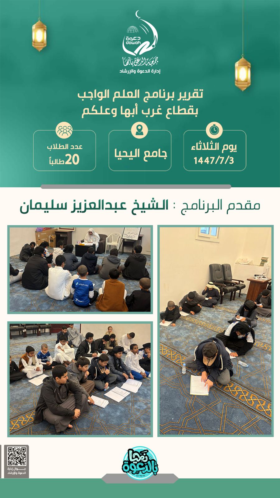 تم إقامة برنامج العلم الواجب بقطاع غرب أبها وعلكم يوم الثلاثاء 3 / 07 / 1447هــ بجامع اليحيا، بحضور 20 طالباً، بتقديم من الشيخ عبدالعزيز سليمان.