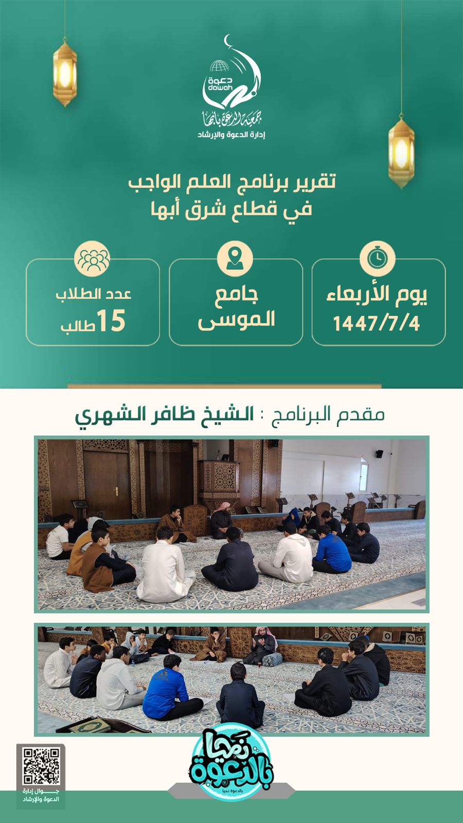تم إقامة برنامج العلم الواجب بقطاع شرق أبها يوم الأربعاء 04 / 07 / 1447هــ بجامع الموسى، بحضور 15 طالباً، بتقديم من الشيخ ظافر الشهري.