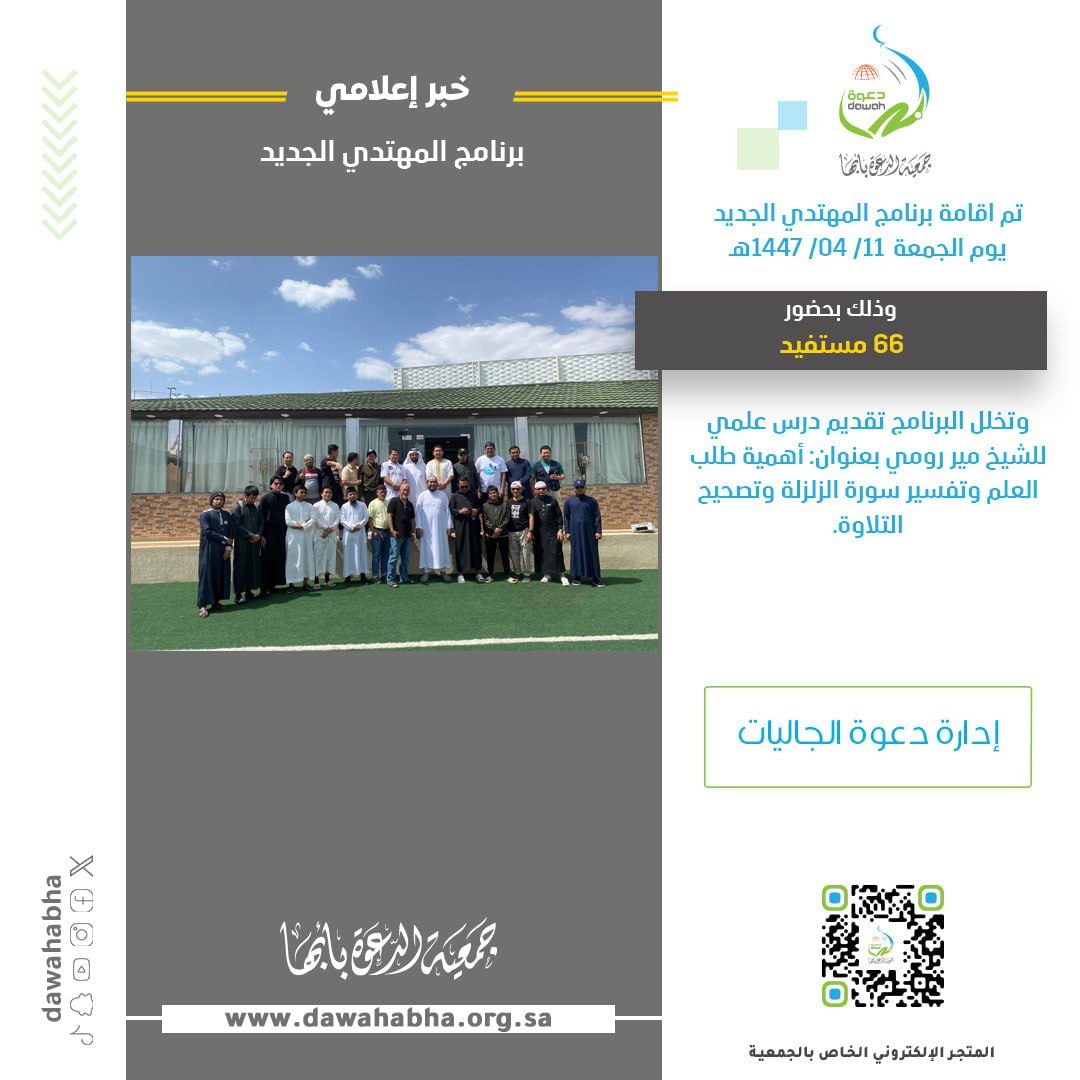 برنامج المهتدي الجديد يوم الجمعة الموافق 12/ 04/ 1447هـ، وذلك بحضور 66 مستفيد، وتخلل البرنامج تقديم درس علمي للشيخ مير رومي بعنوان: أهمية طلب العلم وتفسير سورة الزلزلة وتصحيح التلاوة.