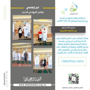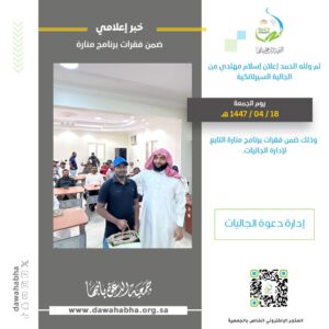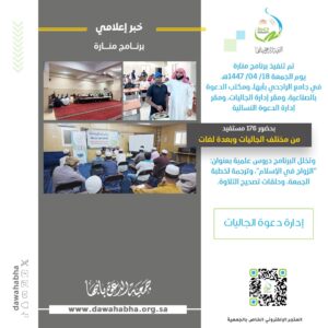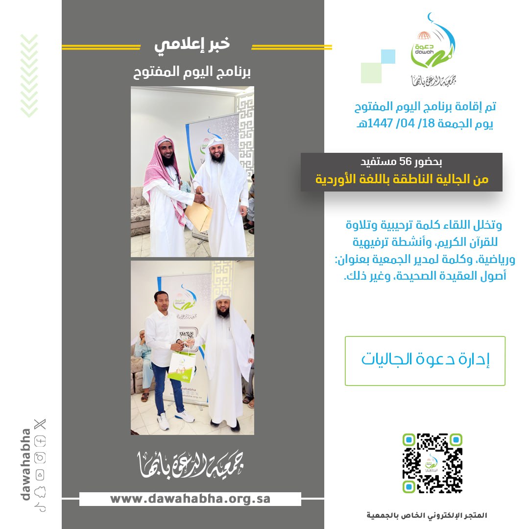 تم إقامة برنامج اليوم المفتوح يوم الجمعة 18 / 04 / 1447هــ بحضور 56 مستفيد من الجالية الناطقة باللغة الأوردية، وتخلل اللقاء كلمة ترحجيبية وتلاوة للقرآن الكريم، وأنشطة ترفيهية ورياضية، وكلمة لمدير الجمعية بعنوان: أصول العقيدة الصحيحة، وغير ذلك.