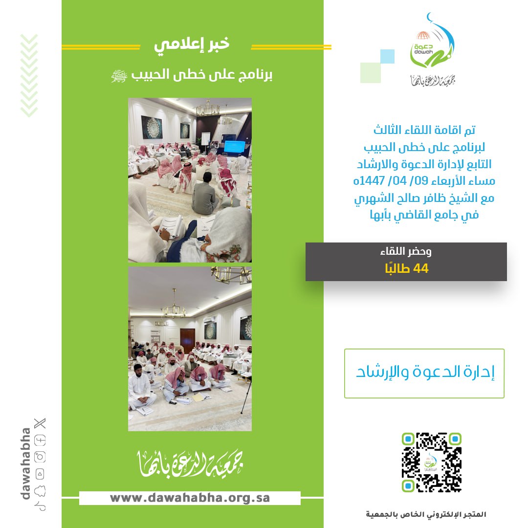 تمإقامة اللقاء الثالث لبرنامج على خطى الحبيب صلى الله عليه وسلم الدعوة بأبها التابع لإدارة الدعوة والإرشاد مساء يوم الأربعاء 09 / 04 / 1447هــ،مع الشيخ ظافر صالح الشهري في جامع القاضي بأبها، وحضر اللقاء 44 طالباً.