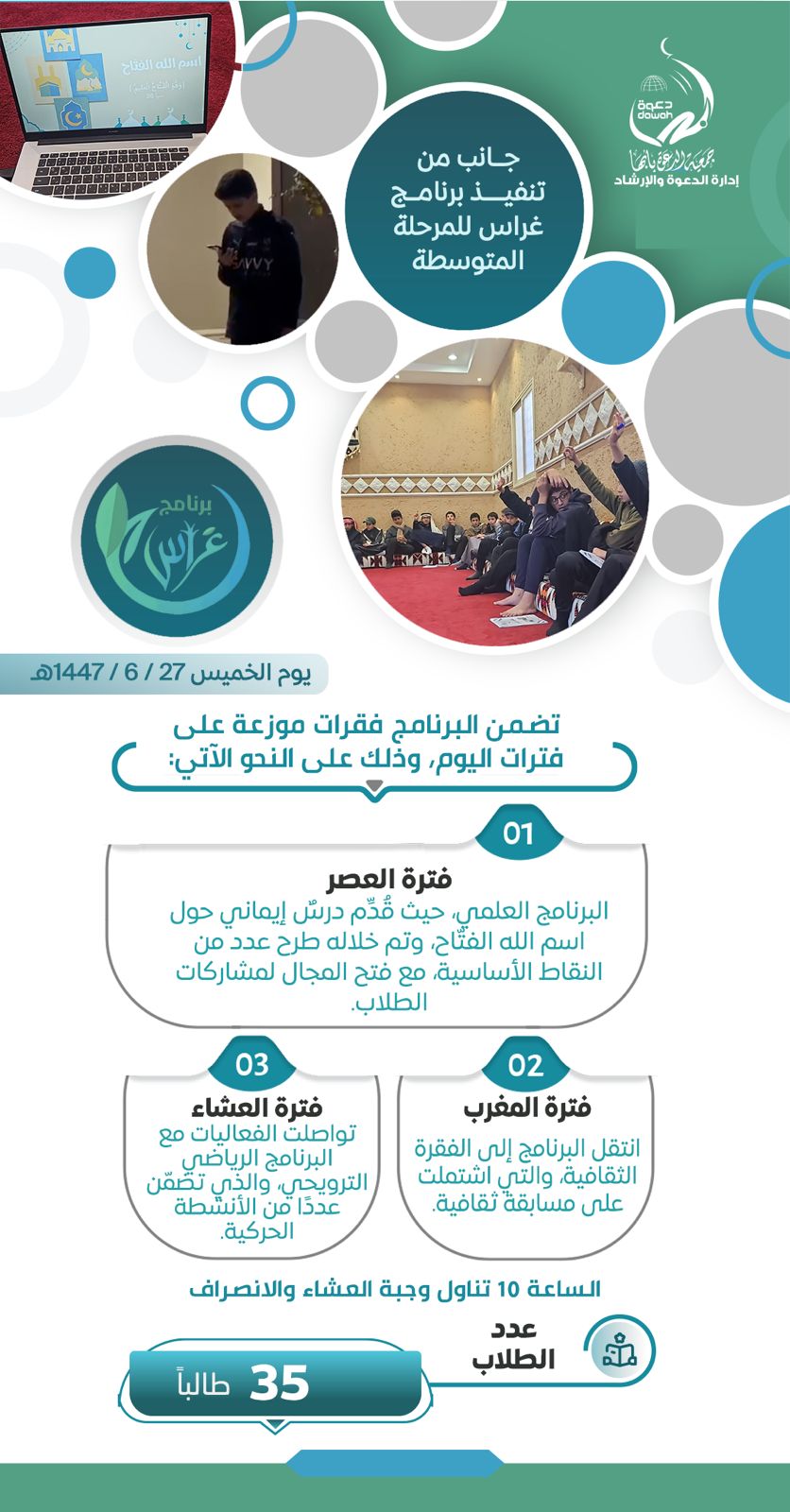 تم إقامة برنامج غراس يوم الخميس 27 / 06 / 1447هــ تضمن عدداً من الفقرات، بحضور 35 طالباً.
