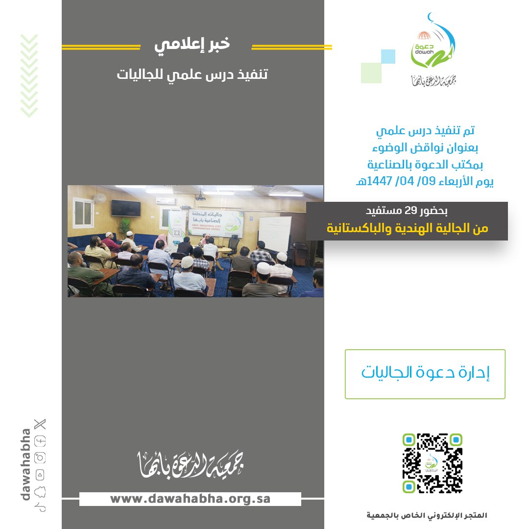 تم تنفيذ درس علمي بعنوان نواقض الوضوء بمكتب الدعوة بالصناعية، يوم الأربعاء 09 / 04 / 1447هــ بحضور 29 مستفيد من الجالية الهندية والباكستانية.