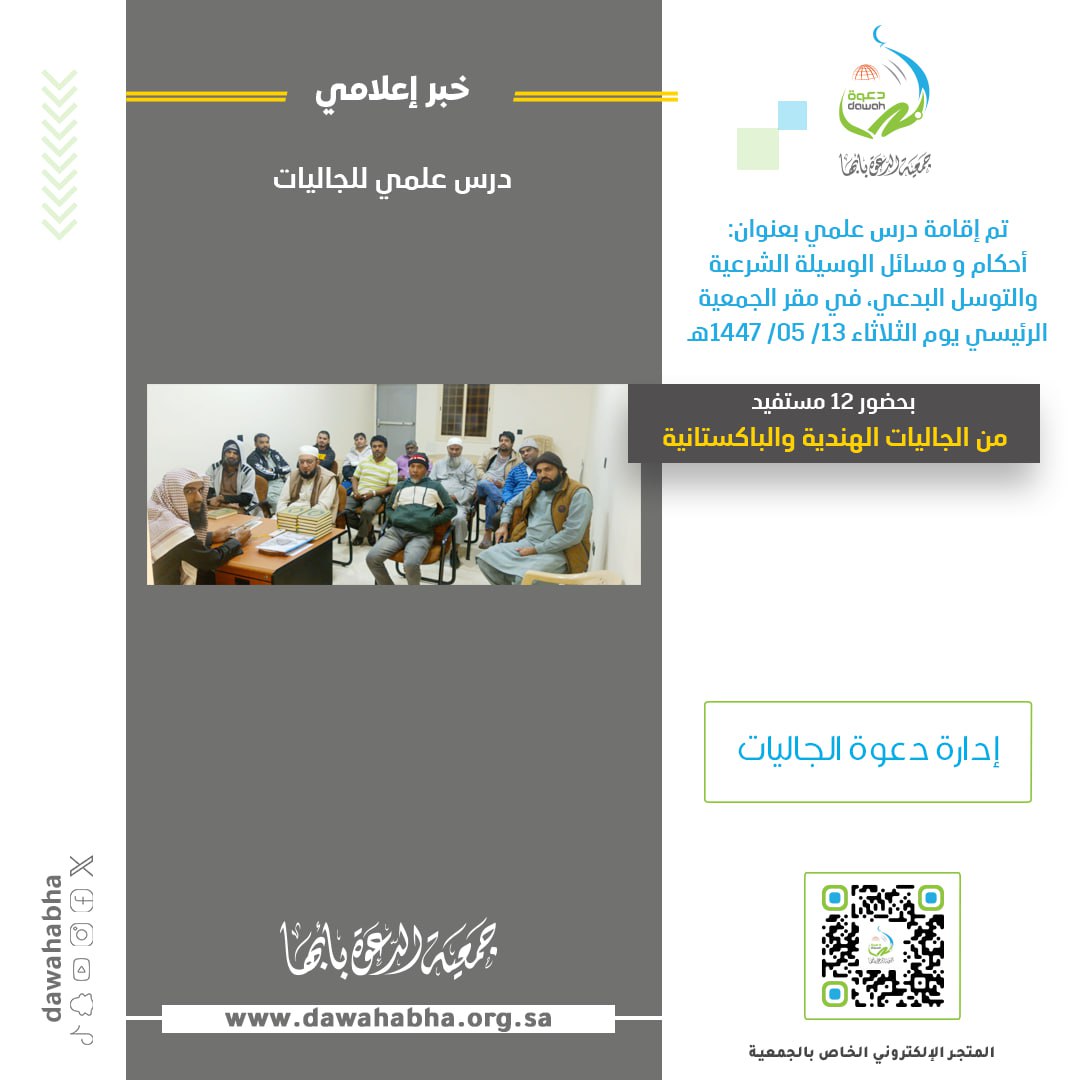 تم إقامة درس علمي بعنوان: أحكام ومسائل الوسيلة الشرعية والتوسل البدعي في مقر الجمعية الرئيسي، يوم الثلاثاء 13 / 05 / 1447هــ، بحضور 12 مستفيد من الجالية الهندية والباكستانية.