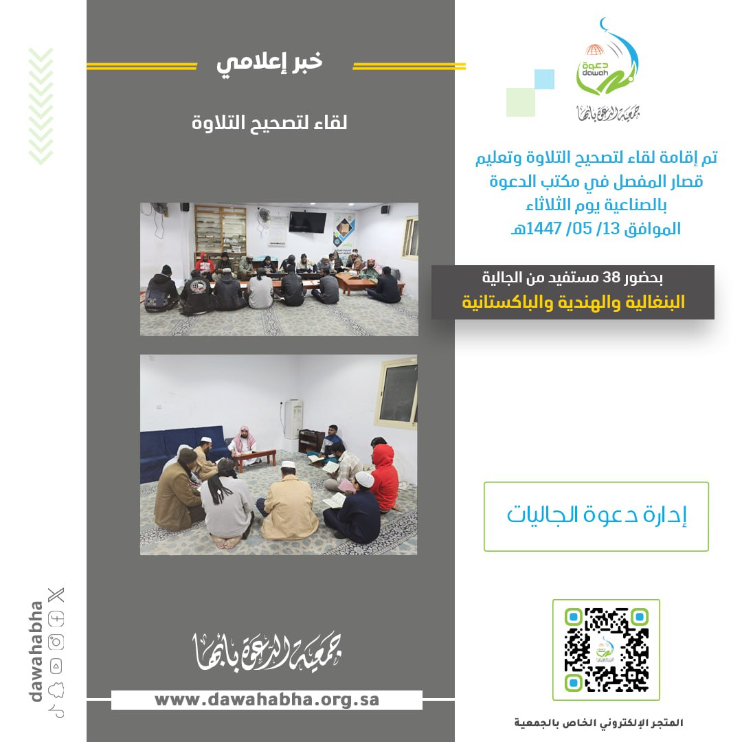 تم إقامة لقاء لتصحيح التلاوة وتعليم قصار المفصل في مكتب الدعوة بالصناعية، يوم الثلاثاء الموافق 13 / 05 / 1447هــ، بحضور 38 مستفيد من الجالية البنغالية والهندية والباكستانية.
