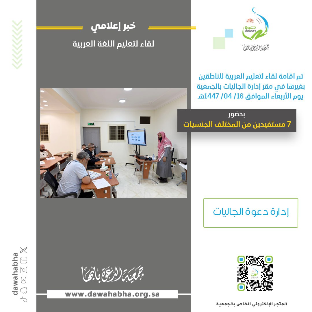 تم إقامة لقاء لتعليم اللغة العربية للناطقين بغيرها في مقر إدارة الجاليات بالجمعية يوم الأربعاء 16 / 04 / 1447هــ، بحضور 7 مستفيدين من مختلف الجنسيات.